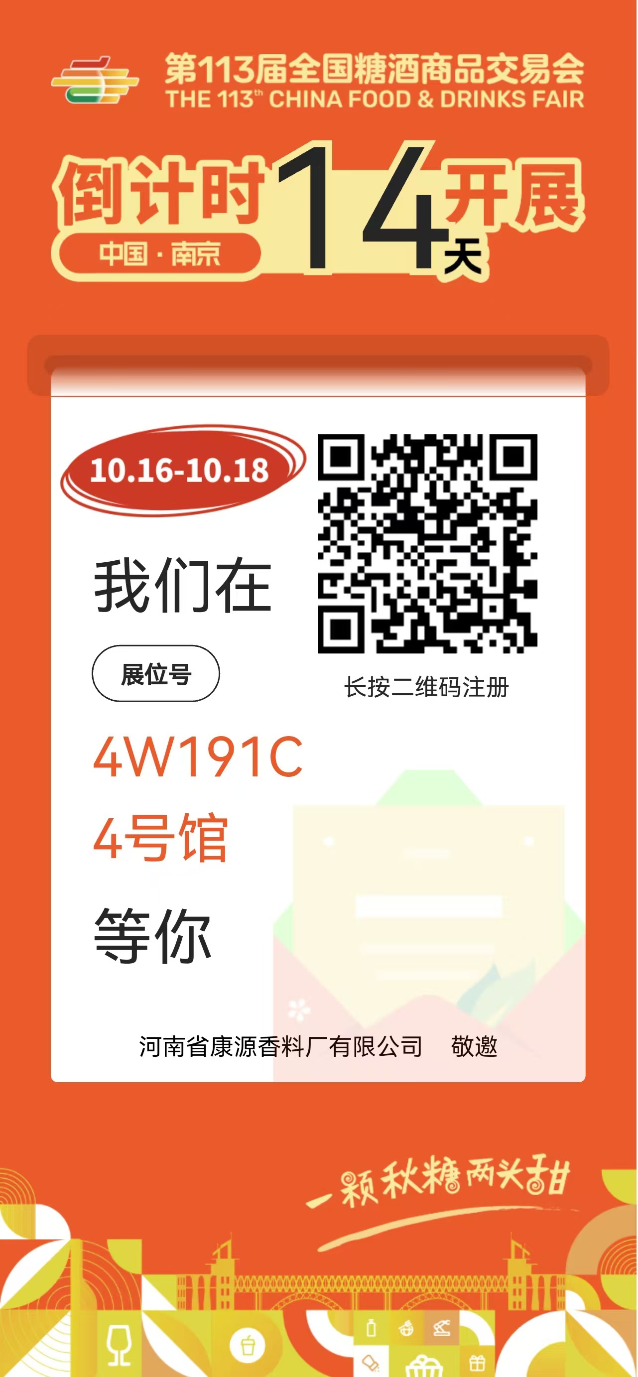 2025年秋季全國糖酒商品交易會在南京國際博覽中心舉行酒店會展時間:10月11日-15日會展中心時間:10月16日-18日展位號:4號館4W191C